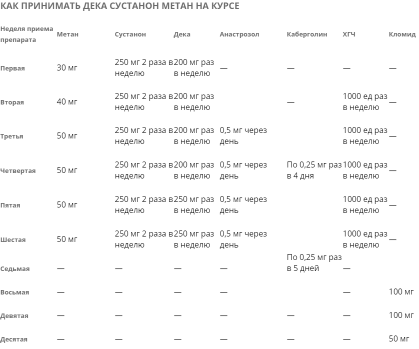 Продолжительность курса дека составляет 8-10 недель, что объясняется его постепенным накапливающим действием. Рекомендуется делать 1 инъекцию стероида объёмом 200-400 мг в неделю. При этом недельная дозировка не должна превышать 600 мг.
